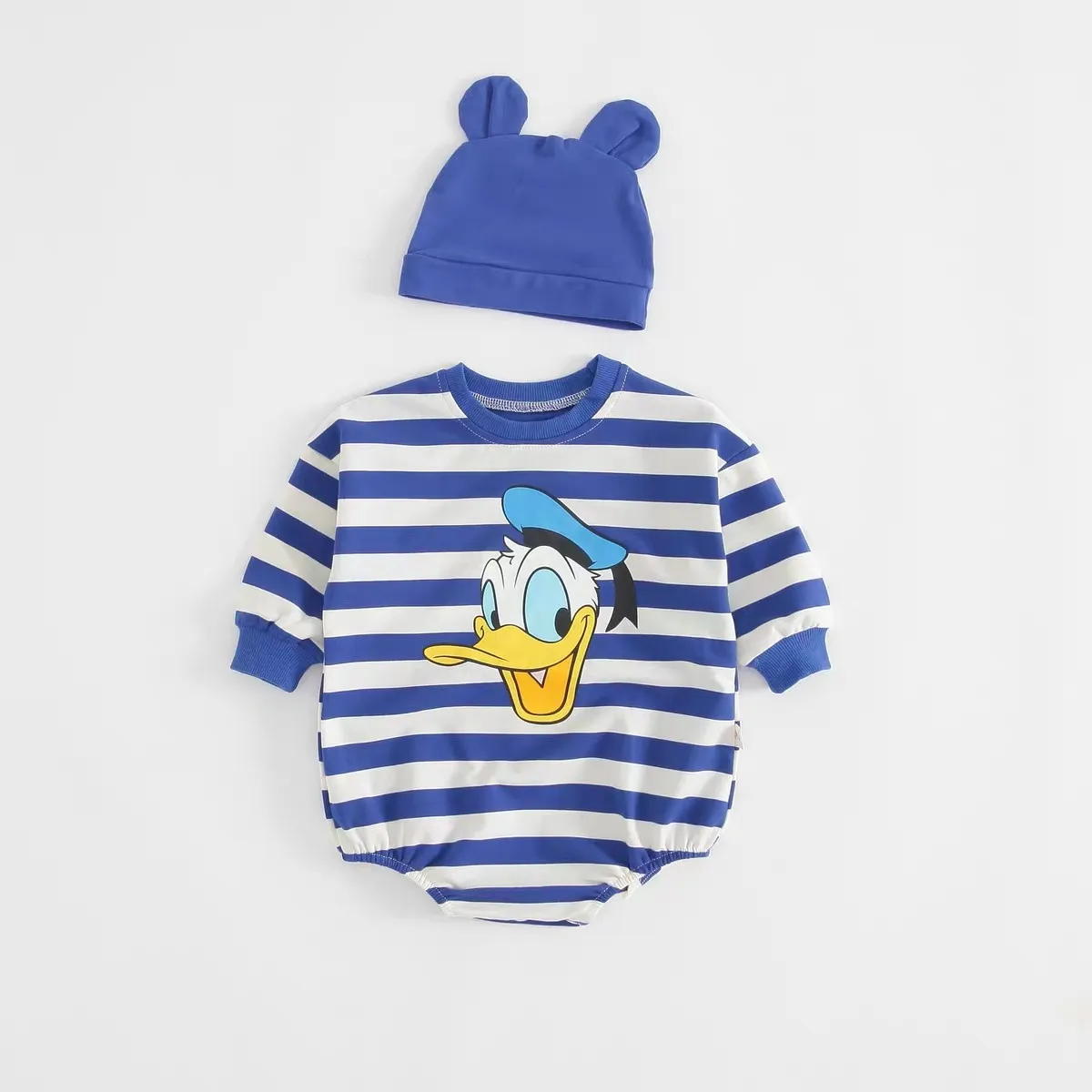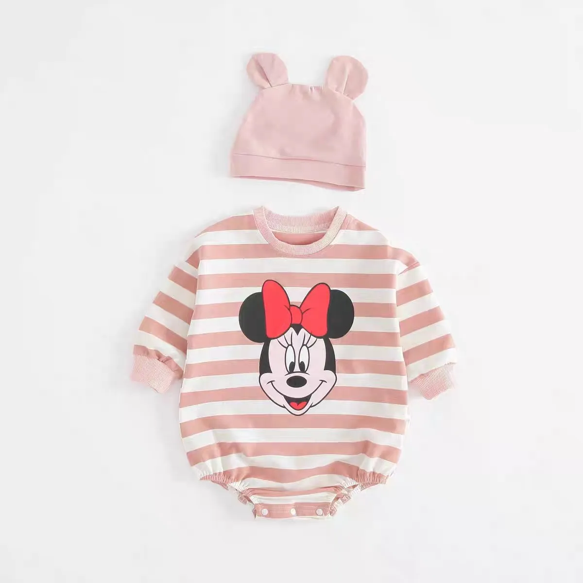 Striped Mickey Baby Long Sleeve Cotton Bodysuit With Hat