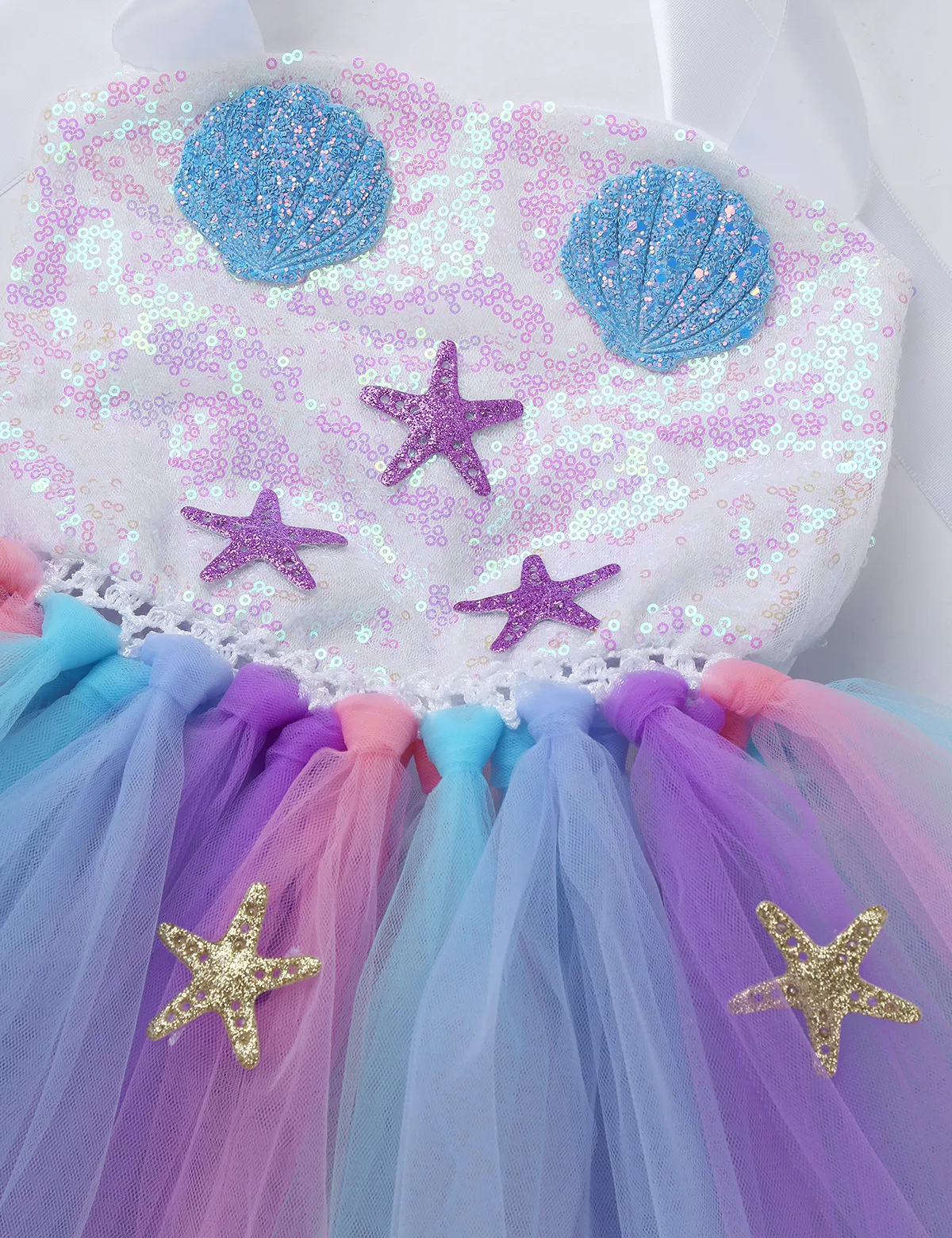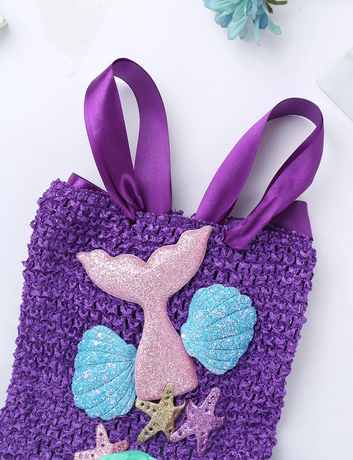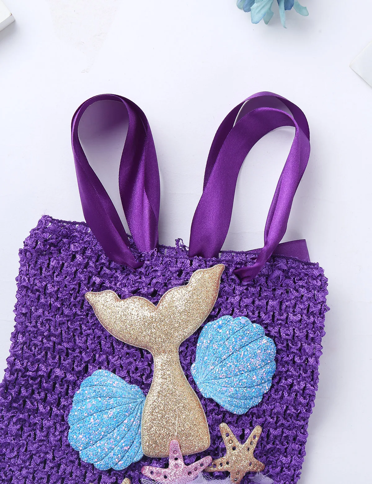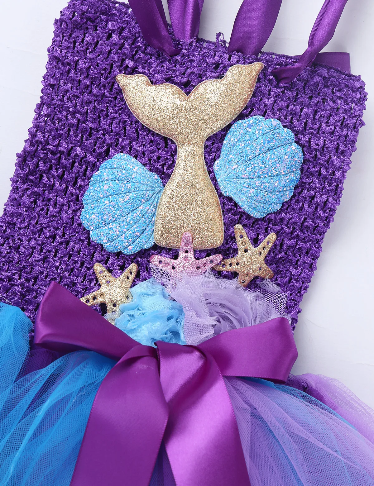 Adjustable ribbon shoulder straps can be tied a bowknot at back. Elastic crochet top bodice front adorned with mermaid tail, scallop and starfish applique.
