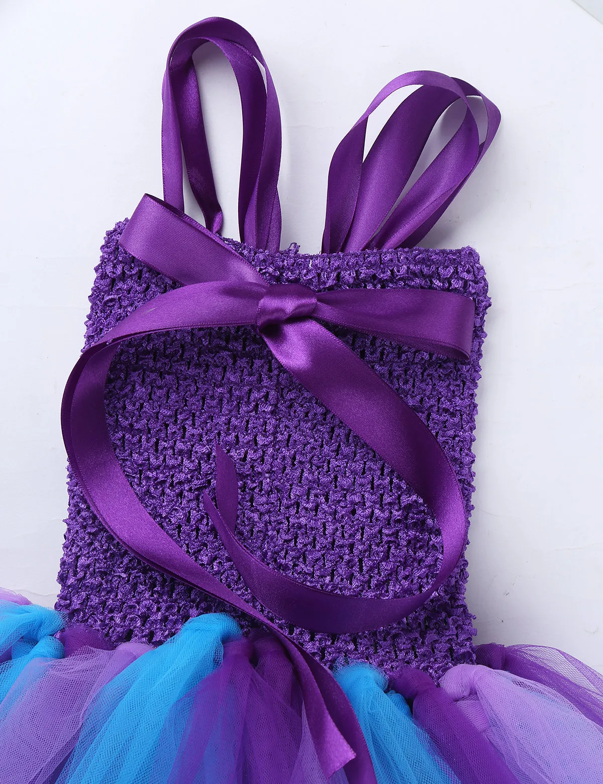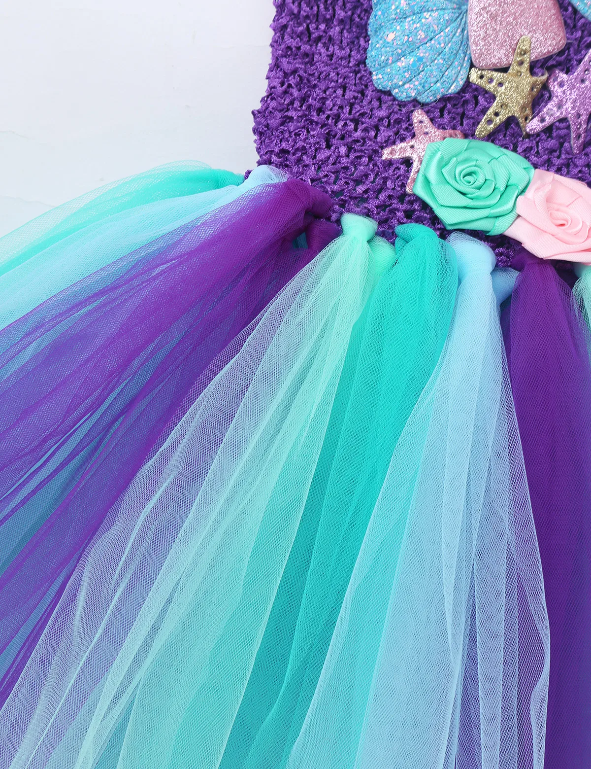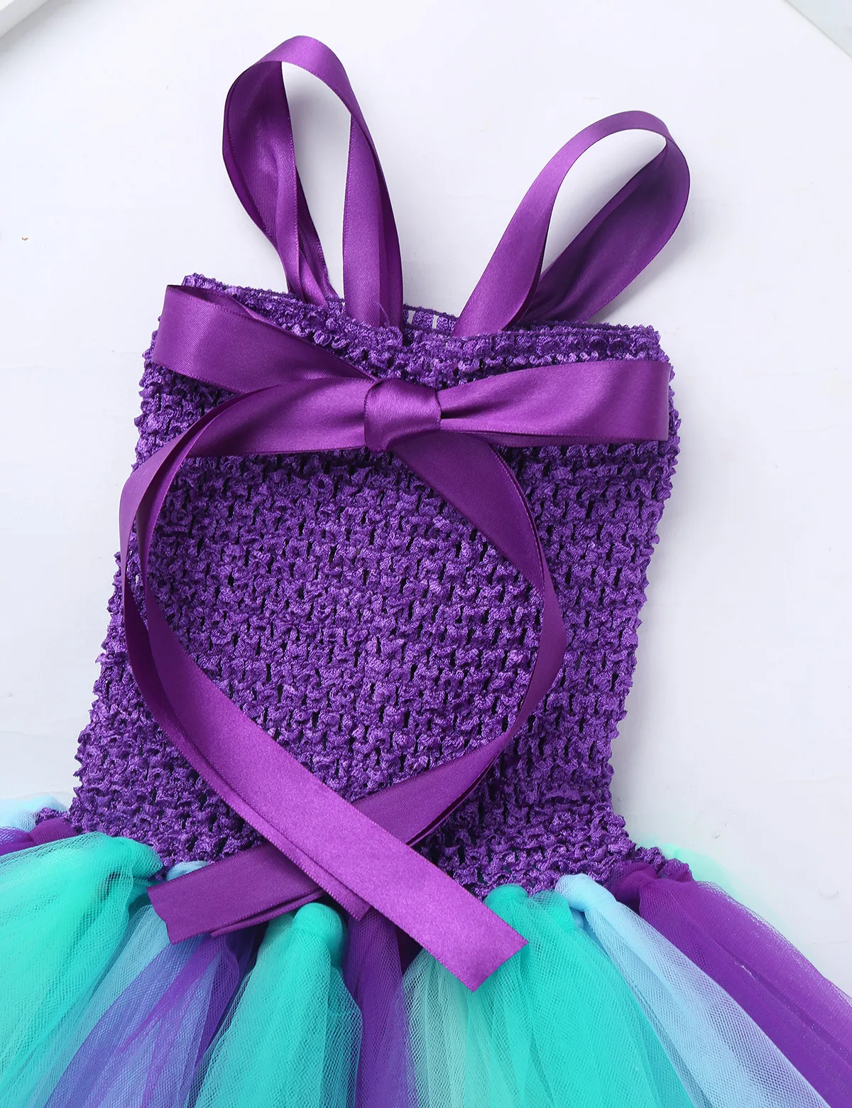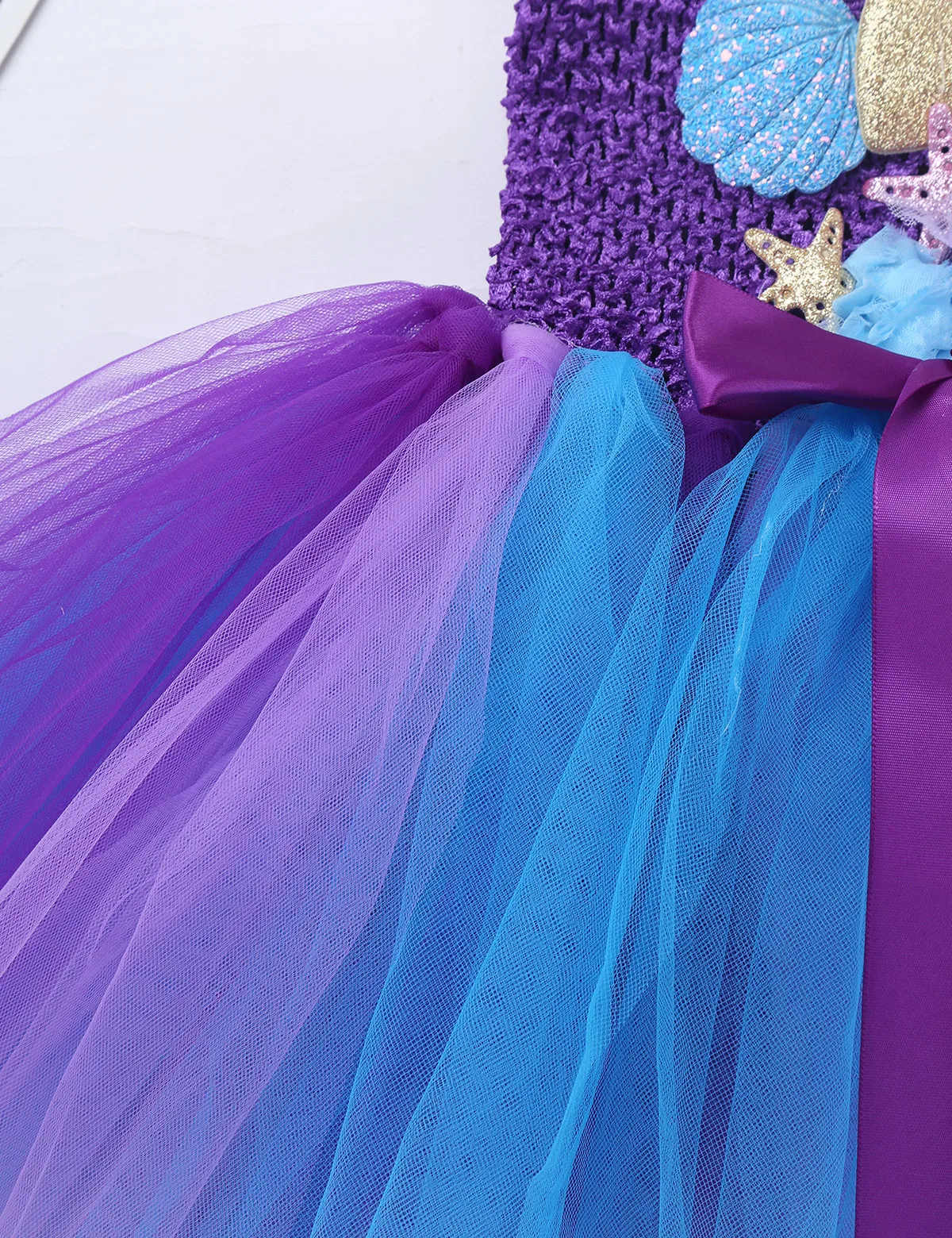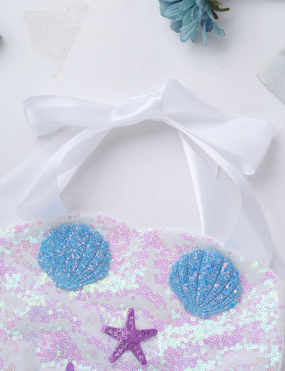 Adjustable ribbon shoulder straps can be tied a bowknot at back. Elastic crochet top bodice front adorned with mermaid tail, scallop and starfish applique.