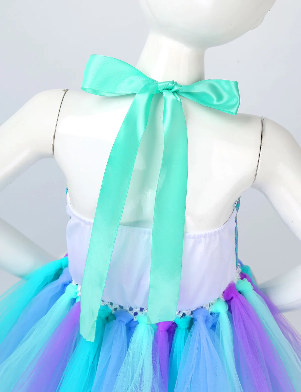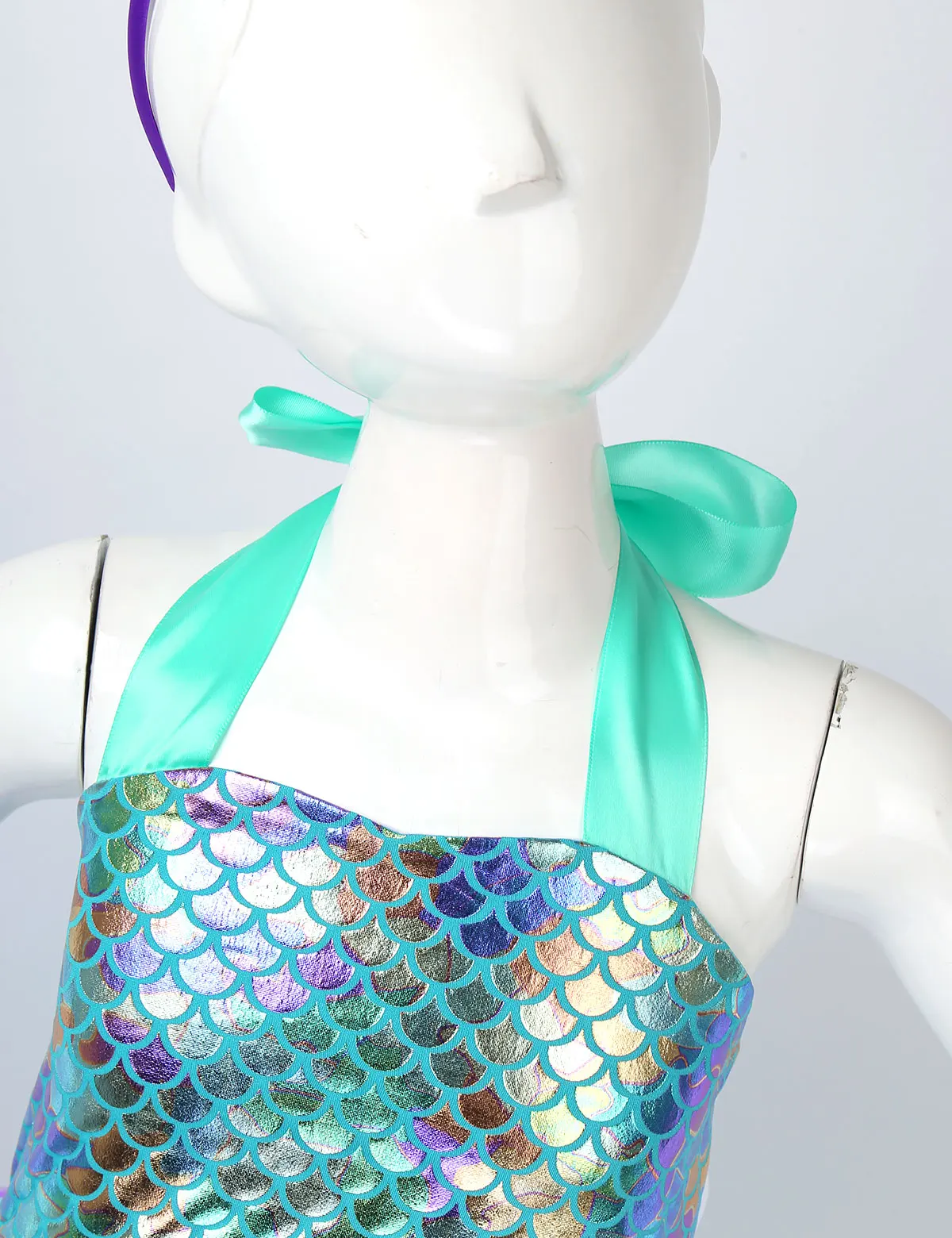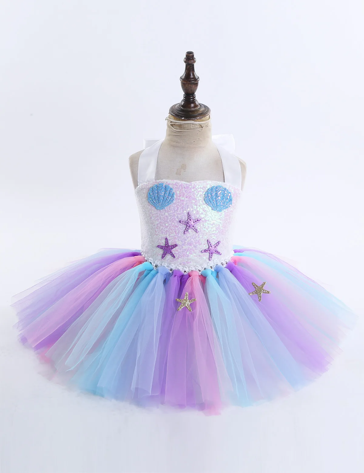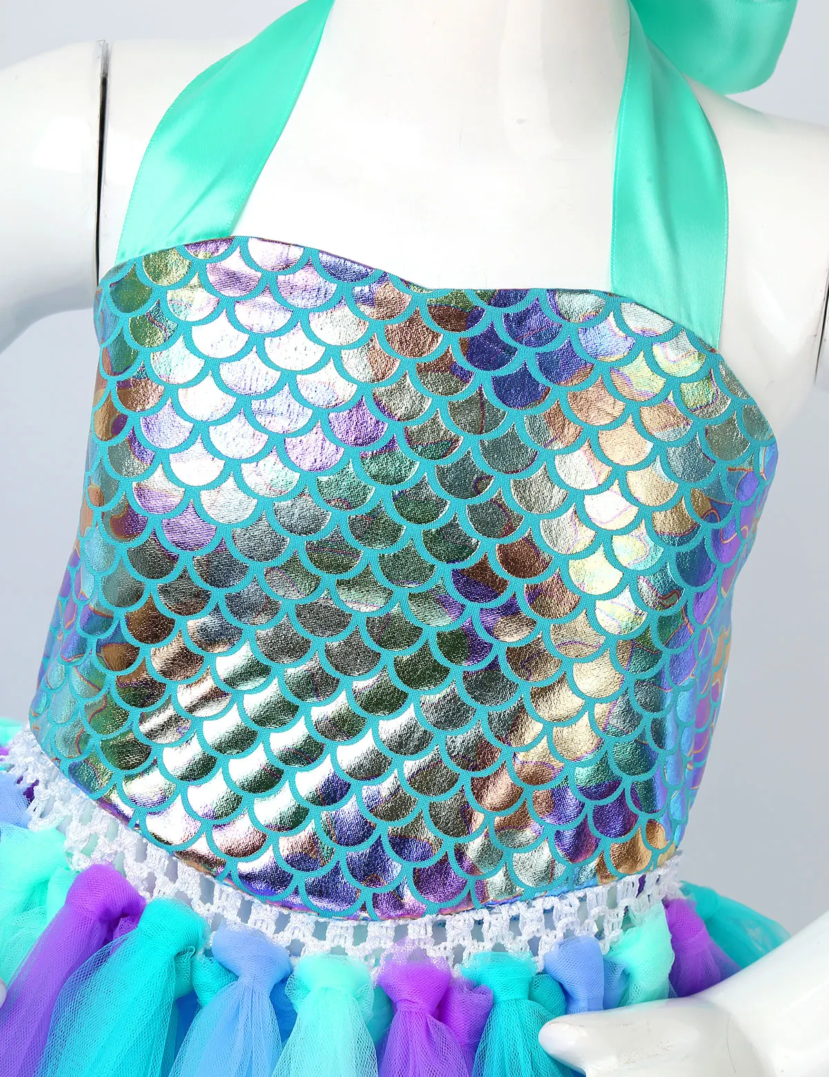 Adjustable ribbon shoulder straps can be tied a bowknot at back. Elastic crochet top bodice front adorned with mermaid tail, scallop and starfish applique.