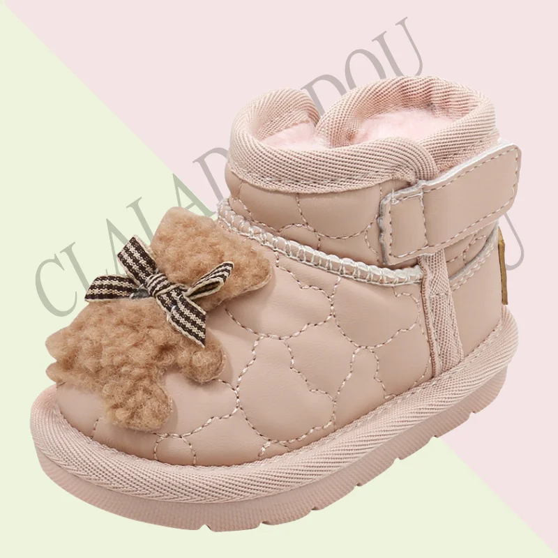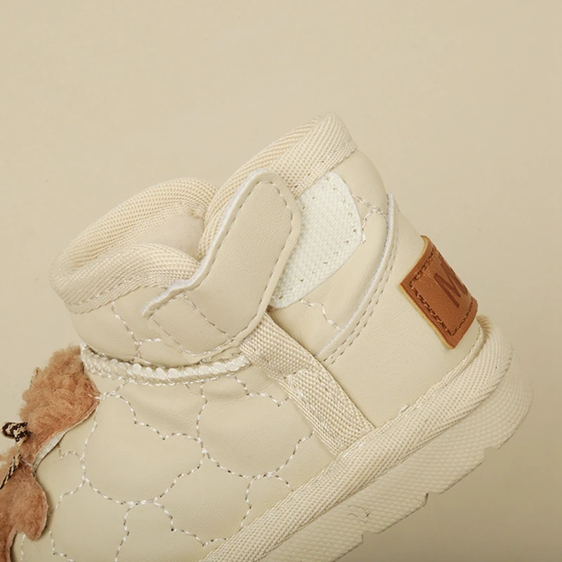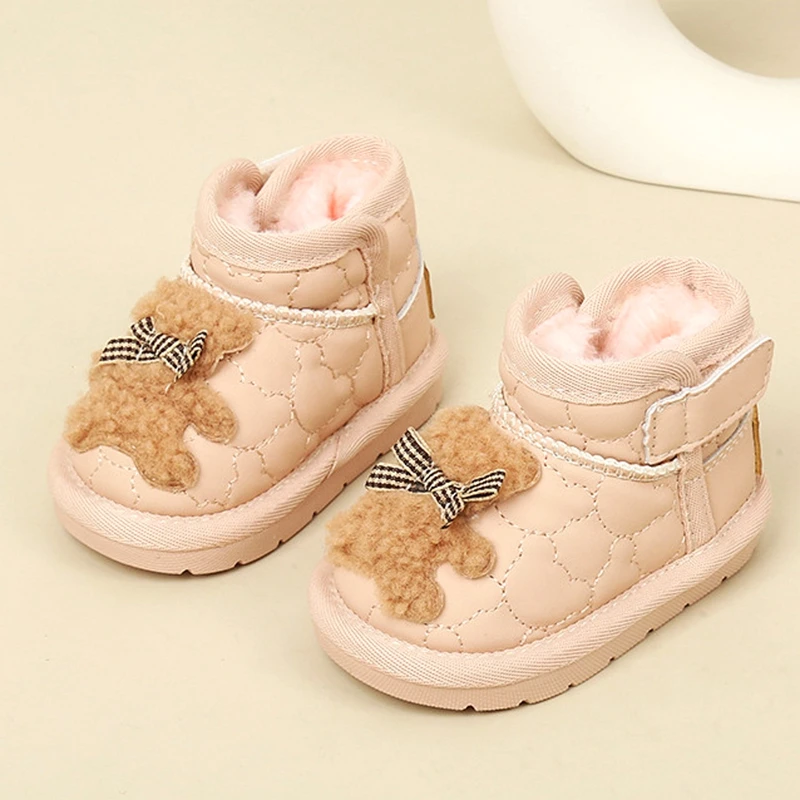 Baby Girls Cute Snow Boot With Cartoon Sewing Beige Pink Warm Ankle Boots With Thick Plush Soft Toddler Kids Boys Winter Shoes